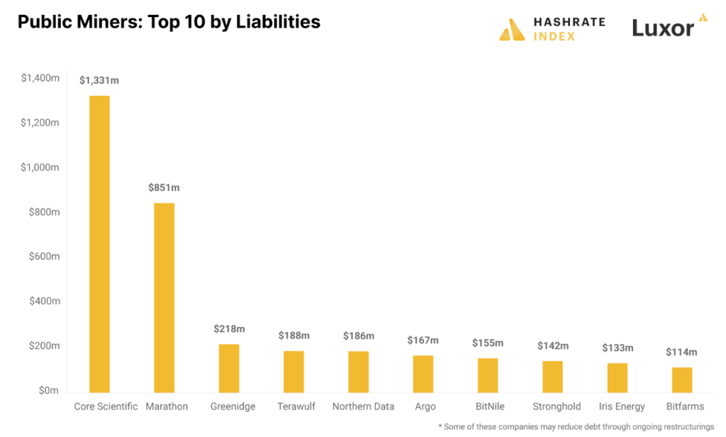 The ongoing bear market has hurt the Bitcoin mining industry after taking on sizeable debt loads during the bull market of 2021. The top 10 cryptocurrency mining debtors are said to owe more than $2.6 billion, according to Hashrate Index, while the collective debt of all miners is $4bn.
