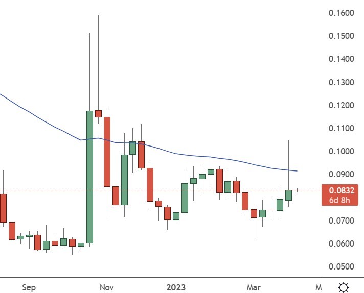 The price of DOGE jumped to the $0.1000 level on the week before retreating back to $0.0835. That level coincides with the 50 moving average on the weekly chart and offers initial resistance for another push higher.