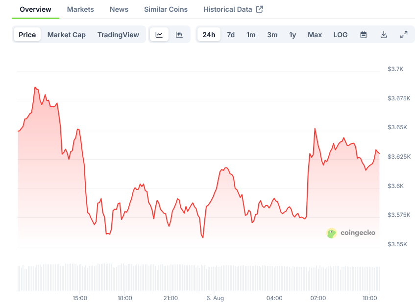 On the upside, ETH faces resistance at $3,620, followed by a stronger barrier at $3,700. Breaking above $3,750 could open the path to $3,820 and potentially $4,000.