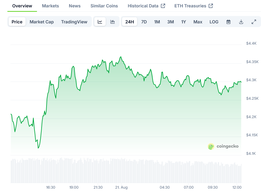 • Ethereum is currently trading at $4,369, gaining 5.52% in 24 hours but down 8.27% over the past week
