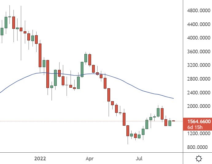 ETH was trading above the $1,500 level, and the next significant resistance is at $2,200.