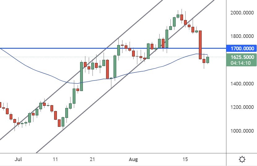 ETH was hovering above the $2,000 level as we started the week but was at $1,600 after another move lower. The decline in cryptocurrency markets started during overnight trading ahead on Thursday after higher-than-expected inflation data from Germany. The country’s annual producer inflation figures rose to a record high of 37% in July, against expectations of 32%.