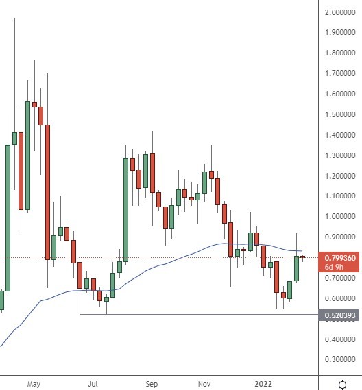 XRP trades above $0.8000 and on a weekly chart of XRP there is hope for a bottom with the support at the $0.5200 level. Resistance would be seen at the $1.00 price point.